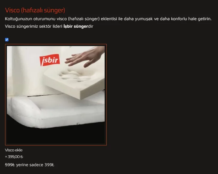 Bu yüzden biz oturağımızı özel bir kıvamda döktüğümüz poliüretandan süngerden tek parça yapıyoruz. Oturaklarımız ne çok yumuşak ne çok sert. Ancak koltuğunuzun oturağı sert geliyorsa veya yumuşak seviyorsanız koltuğunuza visco ekleme yapmayı veya ek visco minder koymayı düşünebilirsiniz.