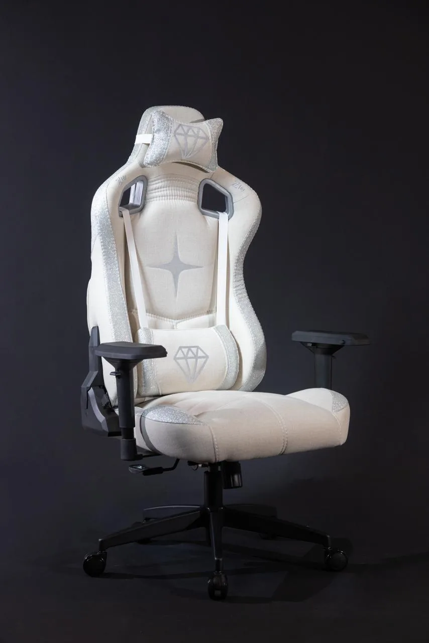 TU-BTOQC3 Tasarım Ürünü ile konfor ve stilin mükemmel uyumunu keşfedin. Oyun alanınızı veya çalışma ortamınızı dönüştürmek için tasarlanan bu özel sandalye, her detayıyla göz kamaştırıyor. Zarif beyaz rengi, ışıltılı gümüş detayları ve başlık ile bel yastığındaki elmas motifli işlemeleriyle mekanınıza modern ve lüks bir dokunuş katıyor.